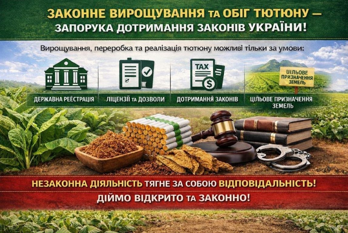 Незаконне вирощування, переробка або реалізація тютюну може призводити до порушення законодавства, створювати передумови для нелегального виробництва тютюнових виробів та спричиняти втрати надходжень до державного і місцевих бюджетів.